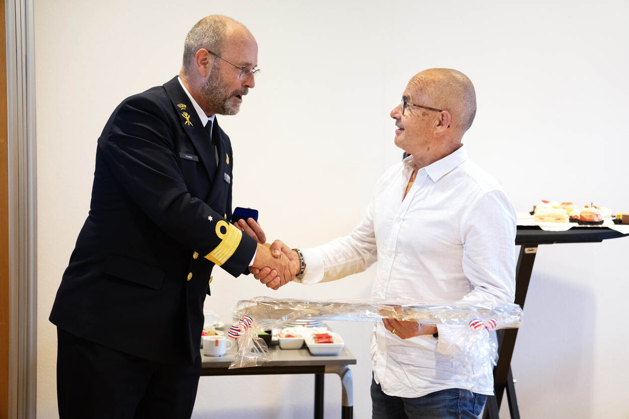 Beng Dave Tan staat tegenover commandeur Jeroen Hodes, die vanaf de rug wordt bezien.