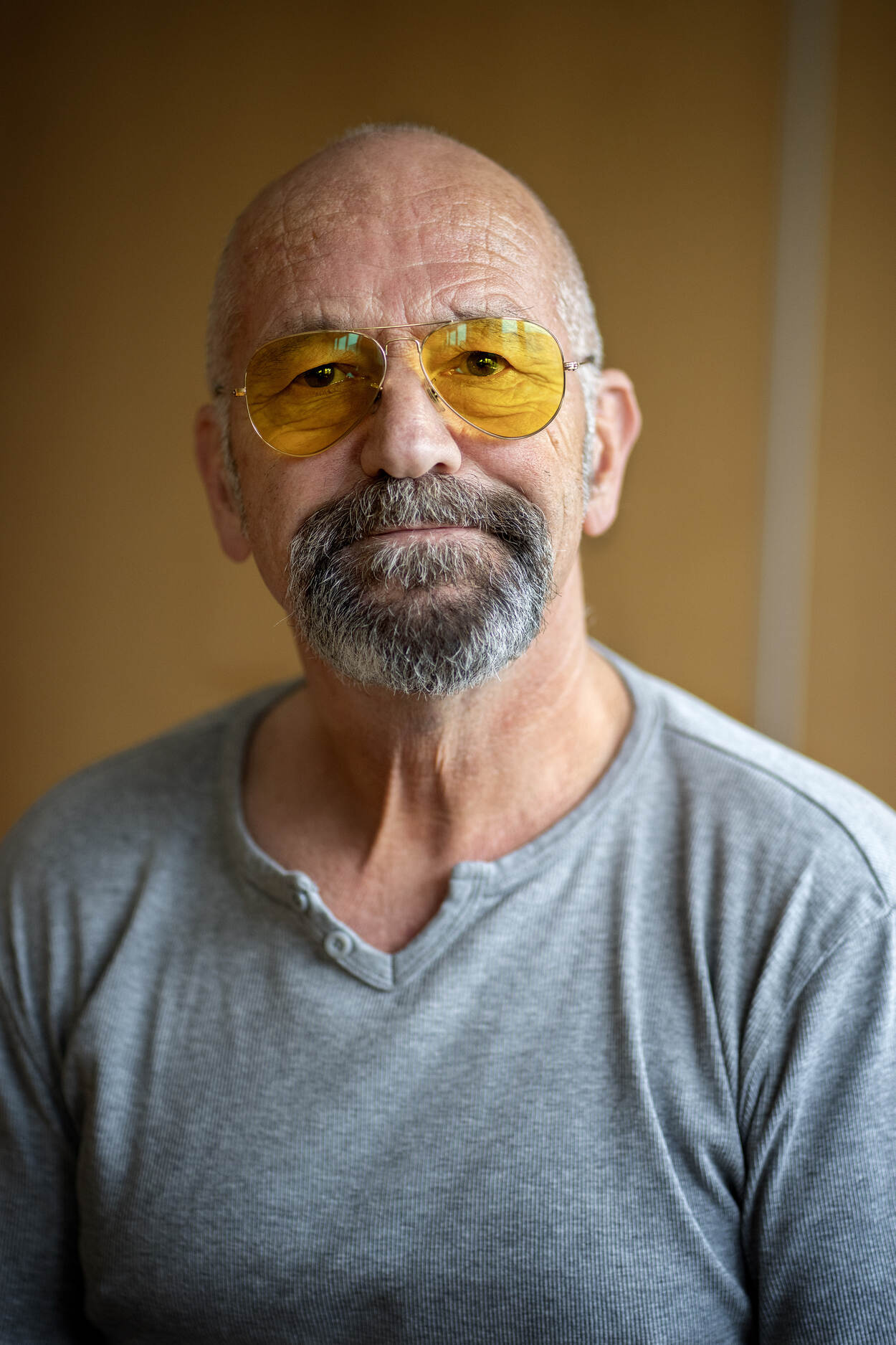 Ton Stavenuiter houdt voor zijn gezicht enkele foto’s van vroeger.