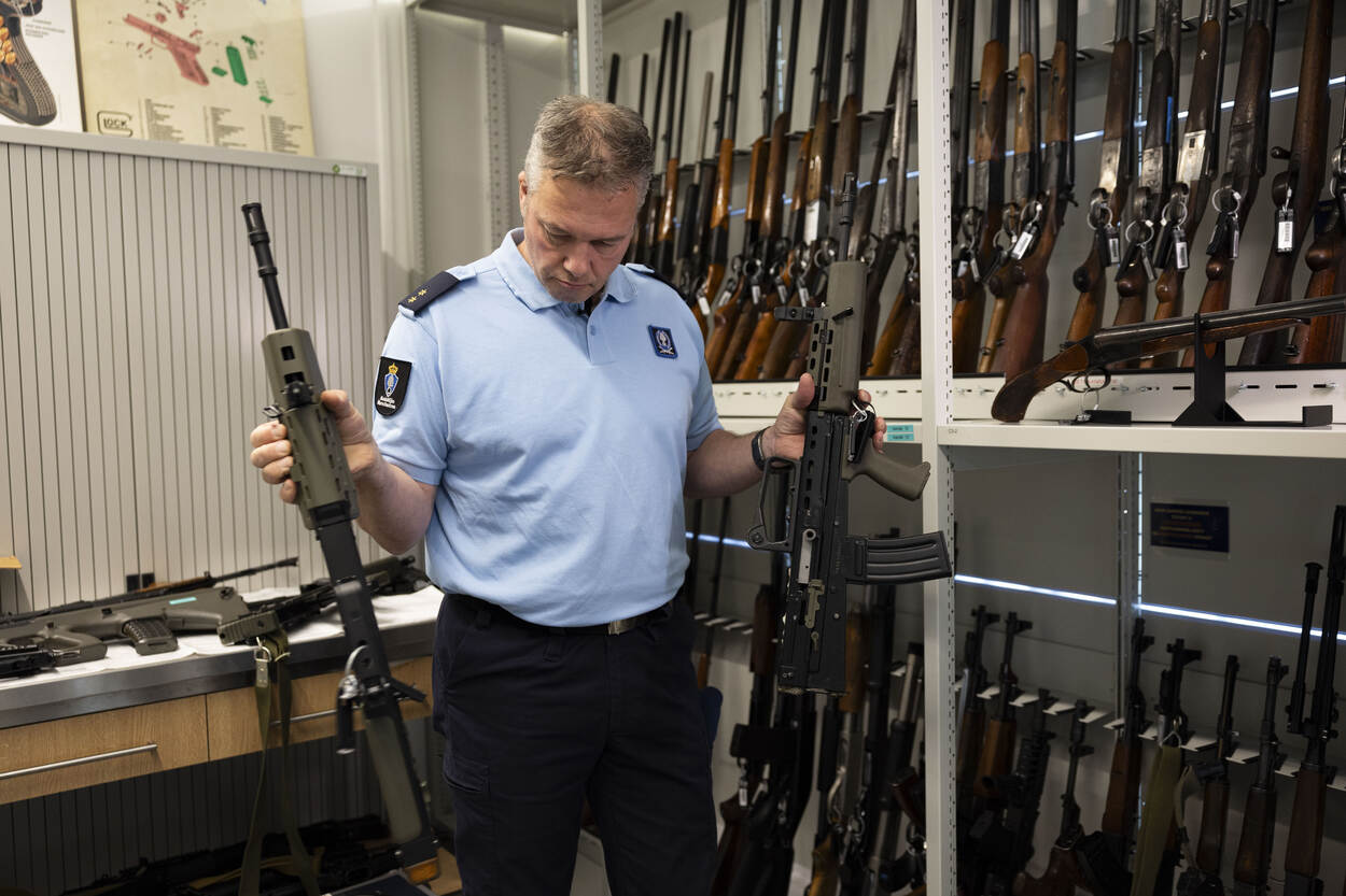 Ook staan er veel nepwapens in de kamer. Verboden wanneer ze niet van echt te onderscheiden zijn. Van Doormolen toont twee vrijwel identieke vuurwapens. “Eentje schiet louter airsoftballetjes. De ander: daar moet je écht niet voor staan als die afgevuurd wordt.”