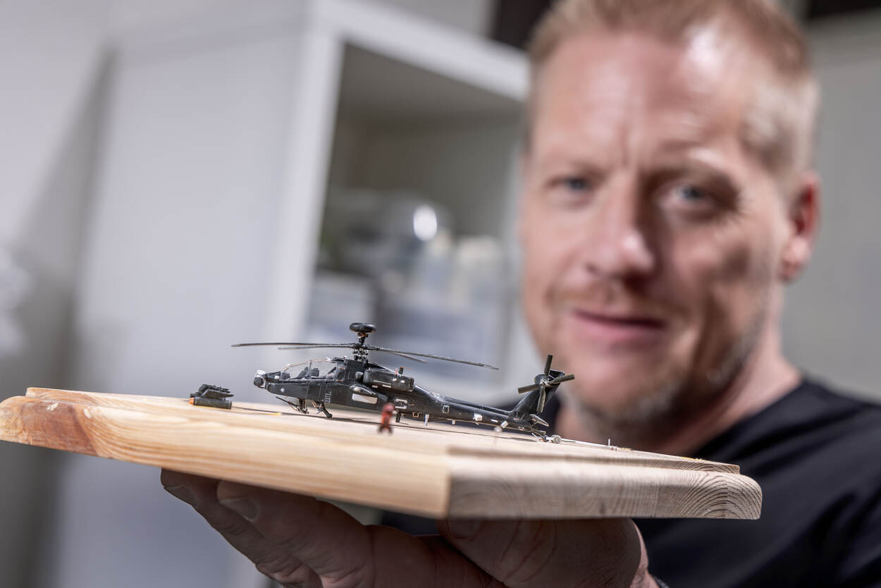 Daarbij klopt ieder detail. “Als basis gebruik ik de plastic modelbouwdozen die breed verkrijgbaar zijn. Maar vaak zijn die onderdelen te simplistisch weergegeven. Dus modificeer ik ze. Zo ontstaan levensechte minikopieën van plastic.” Als voorbeeld neemt hij de uitlaten van een Apache Delta (Longbow)-bouwdoos. “In de bouwdoos zijn die massief aan de achterkant, je kunt er niet inkijken. Maar in werkelijkheid zijn ze hol. Zoiets is een doorn in m’n oog, dus heb ik ze uitgehold.”