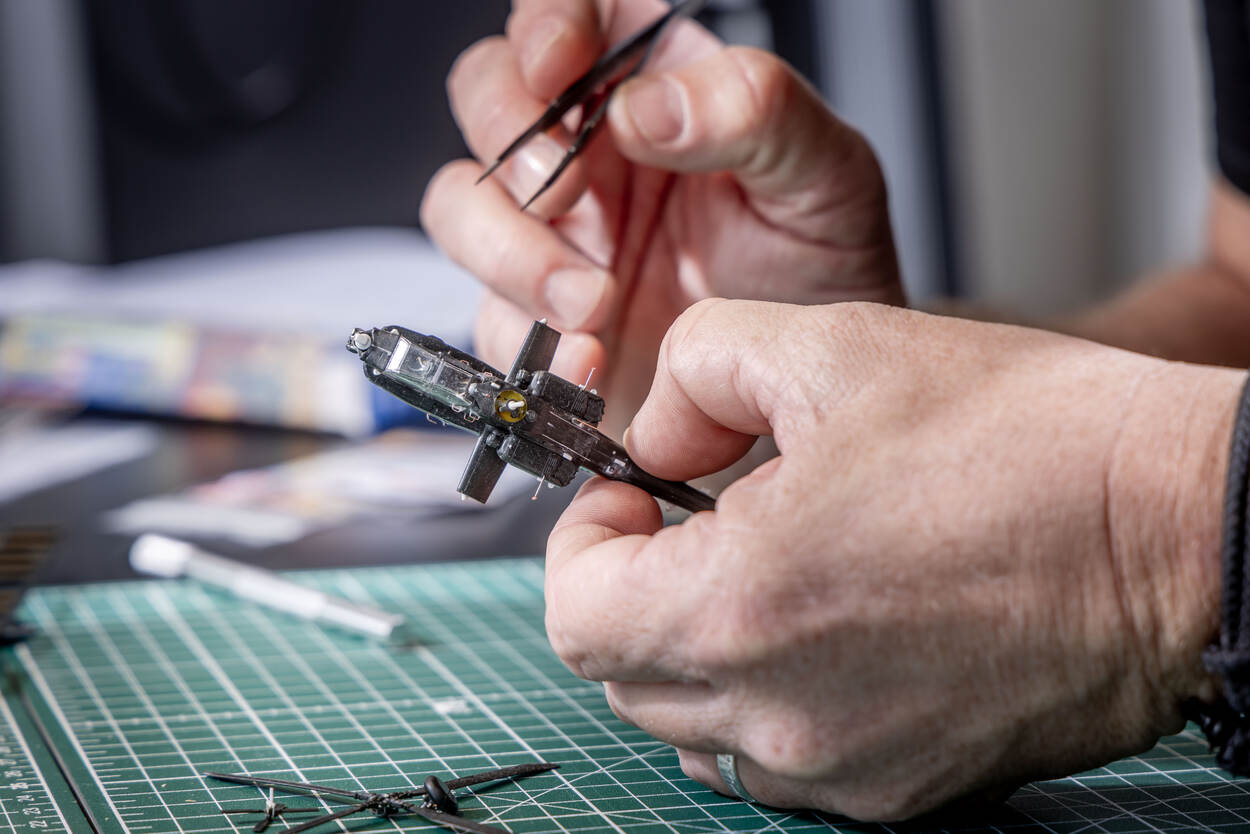 Of het nu gaat om een gedetailleerde Longbow-radar trekstang voor de Apache Echo en de bijbehorende ATA-vliegtuigtrekker of de flightline-brandblusser… Erik Hendriks maakt tot in de detail miniaturen van luchtmachtmaterieel en toebehoren. Soms zijn de onderdelen minder dan een millimeter groot. Met penseel, loep, pincet en andere fijne gereedschappen zet hij onder meer de Super Cub van de Piper Aircraft Corporation, een Spitfire T.Mk9, Mig-21U, MQ-9 Reaper, F-35, F-16 en de Bölkow Bo-105 in elkaar.