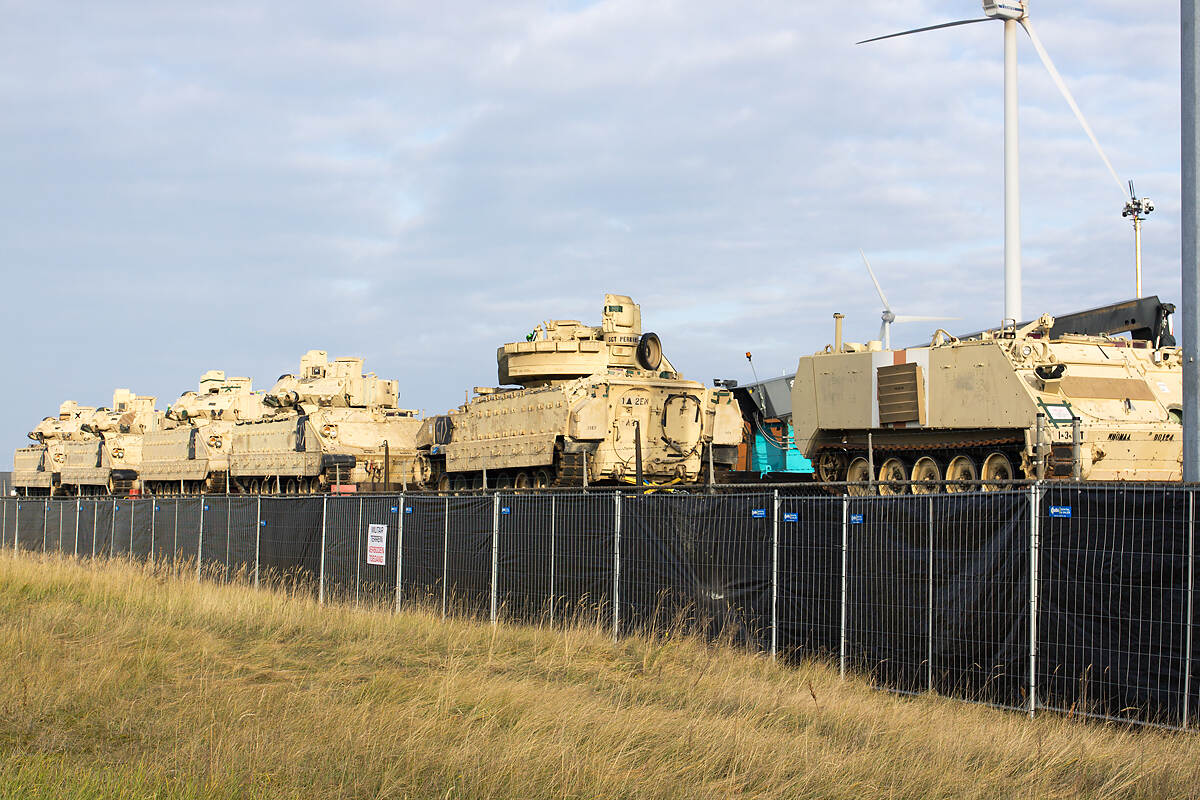 De Eemshaven speelde tot vorige week, samen met de haven van Vlissingen, een grote rol bij het aanlanden en doorvoeren van Amerikaans militair materieel. Ook dat kun je aan Harry Hulshof overlaten, om met een aantal fraaie foto’s op de proppen te komen. Hij ging twee keer kijken in het Hoge Noorden om de spullen van het 3rd Armored Brigade Combatteam uit Fort Bliss (Texas) te zien, vanzelfsprekend met de camera in de hand. “De meeste voertuigen zijn per spoor, via Duitsland, richt Polen vertrokken”, meldt hij. “Ook zijn voertuigen op Roemeense trucks en trailers gezet.”
