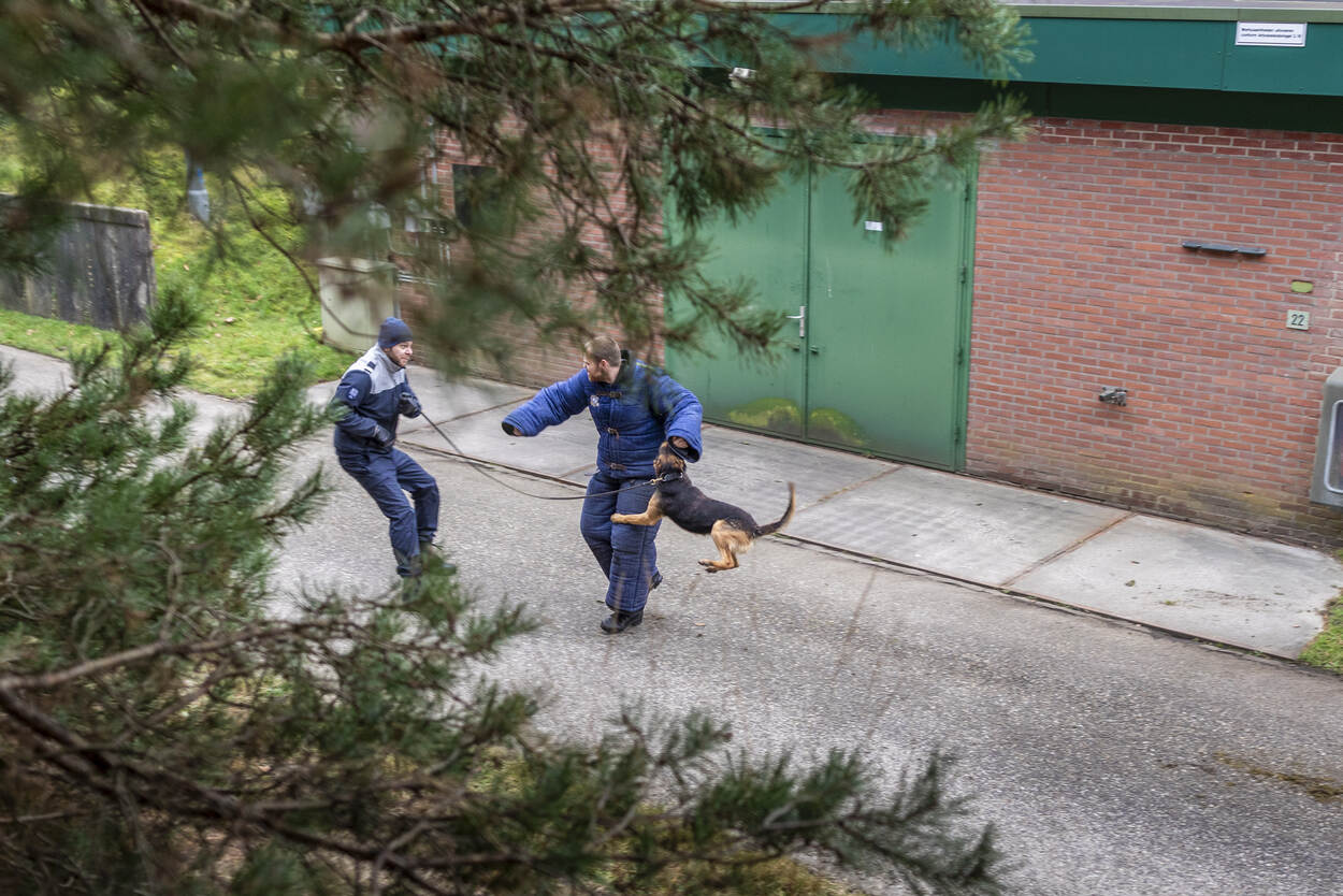 Gevloerd door een fel bijtende bewakingshond wordt de ‘indringer’ aangehouden.