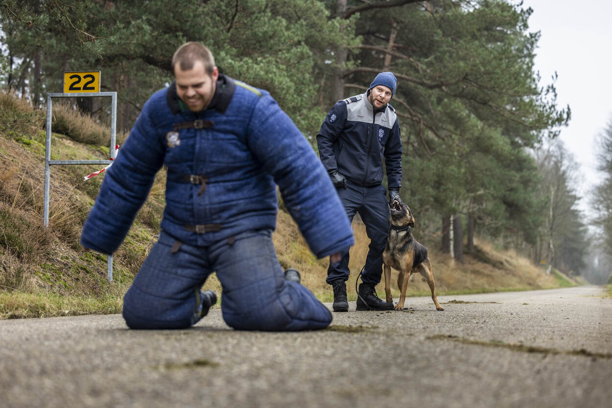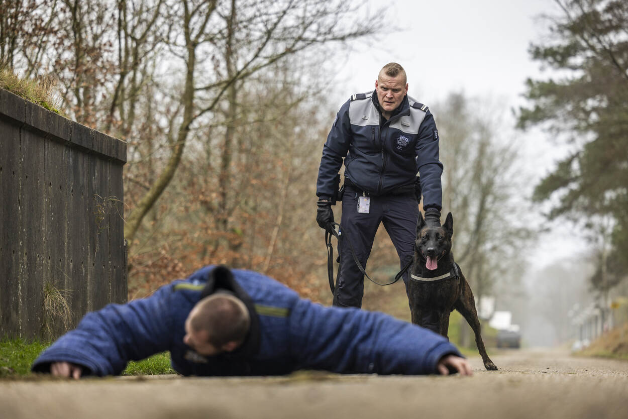 Geleider en hond proberen een ‘indringer’ te pakken, gespeeld door een pakwerker.