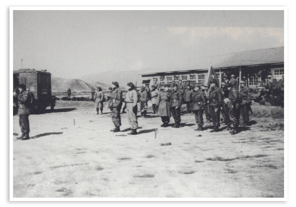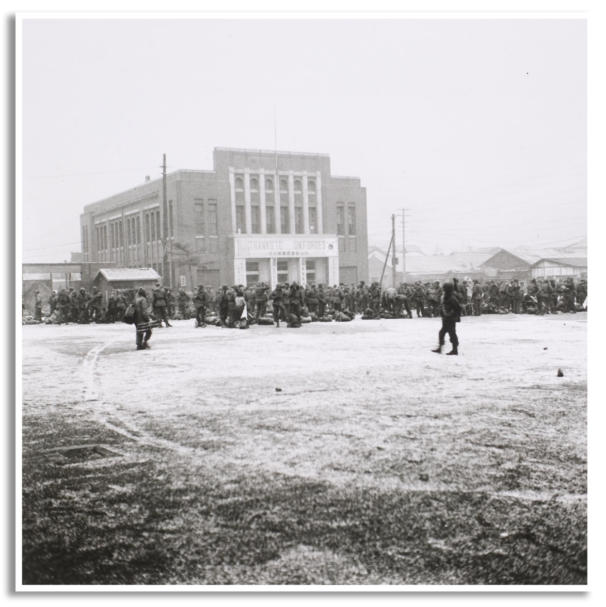 NDVN-militairen voor vertrek verzameld voor het station te Taegu.