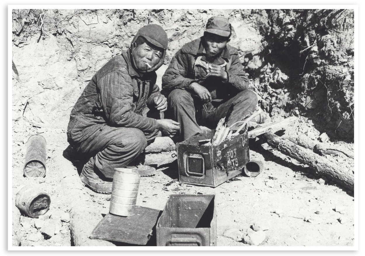 Twee Zuid-Koreaanse militairen van het Civil Transport Corps (CTC), ingedeeld bij het Nederlands Detachement Verenigde Naties in Korea, proberen een vuurtje te stoken in een lege munitiekist. (Foto: archief NIMH)