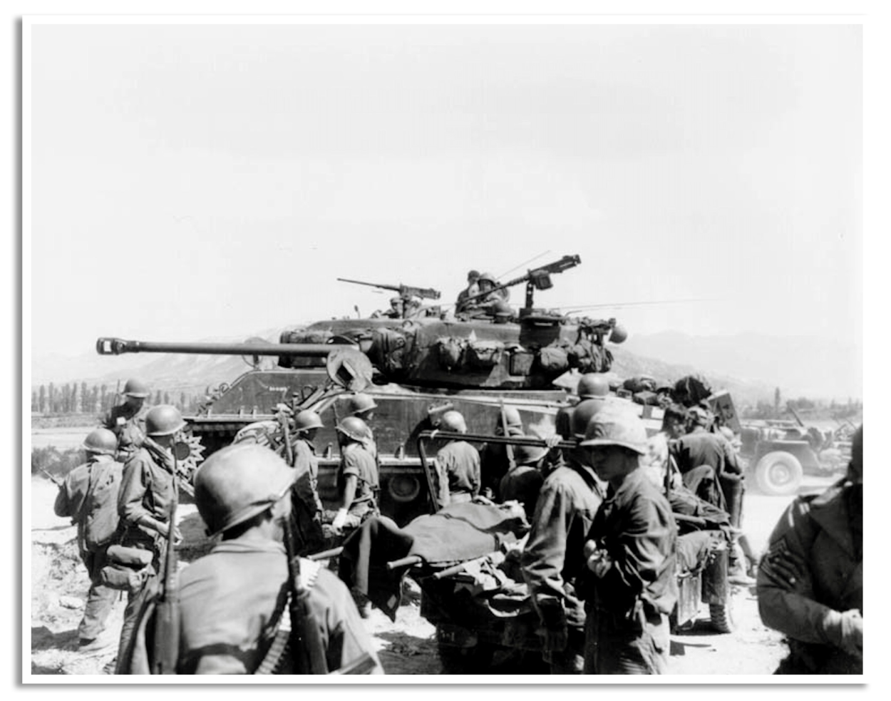 Gewonde Amerikaanse soldaten worden geëvacueerd, terwijl M-4 tanks naar het front trekken bij Koemchoen. (Army photo)