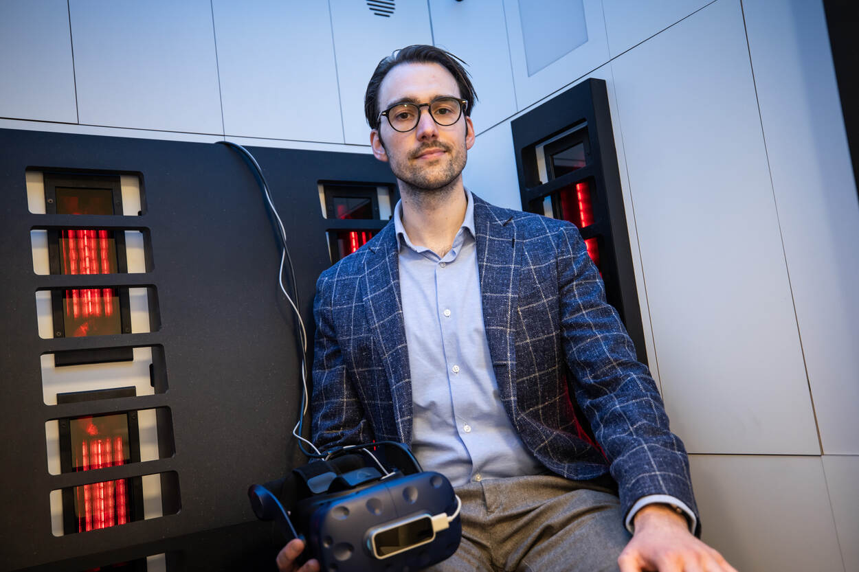 Man met jasje dasje zit in cabine en houdt VR-bril vast.