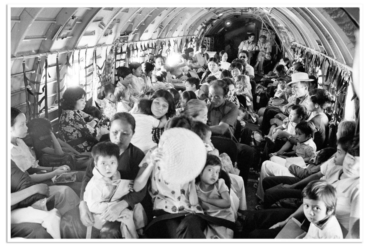Voorafgaande aan de val van Saigon startten de Amerikanen met het evacueren van grote aantallen ‘getrouwe’ Vietnamezen. Op de foto families uit de stad Da Nang, die per C-47 transportvliegtuig de eerste stap naar de VS zetten. (Foto: Nguyen Ngoc Luong, The New York Times)