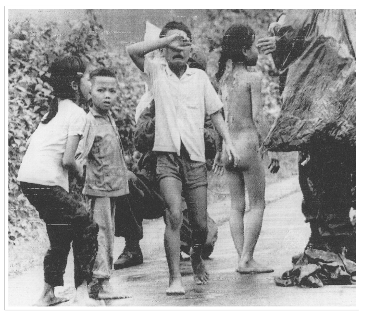 geschrokken en huilende kinderen. Een naakt meisje heeft een grote brandwond op haar rug.