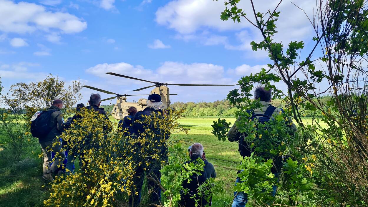 De vliegtuig- en voertuigspotters en andere liefhebbers van militair materieel die een kijkje kwamen nemen bij de oefening, waren niet op tien handen te tellen. De meesten met camera en, het mag gezegd, ze hielden zich daarbij vrijwel allemaal aan de veiligheidsinstructies. Zo ook deze fanaten, die getuige waren van een landing van deze CH-47F MYII CAAS nabij het Drentse dorpje Donderen. Ze zochten allemaal de beste positie voor een foto van deze D-485, die sinds maart 2022 in dienst is bij het 298 Squadron van het Defensie Helikopter Commando. De naam van de maker van deze foto is (zeer) bekend bij de redactie.