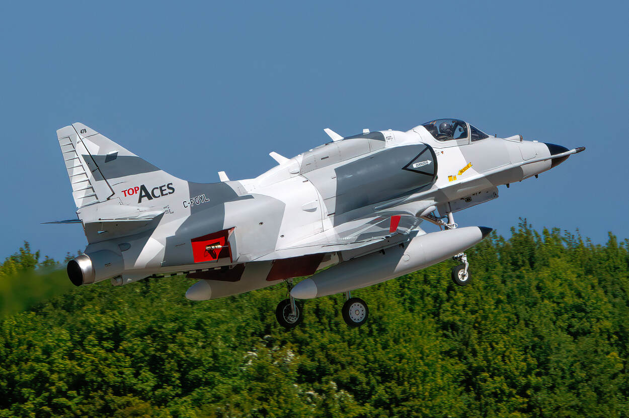 AEC Skyline, dat met vliegtuigen vanaf Groningen-Eelde Airport de krijgsmacht ondersteunt, had het maar druk deze weken. Zo cirkelde er tijdens een landing van de luchtmobiele brigade bij Lauwerzijl constant een ingehuurde Pilatus PC-12 over het strijdtoneel. AEC heeft al langer een samenwerking met het Amerikaanse bedrijf Top Aces. En laat Rob Loonstra nou (niet) toevallig zijn camera bij de hand te hebben toen een Dornier Alpha Jet en Douglas A-4 Skyhawks (foto) van Top Aces op Vliegbasis Leeuwarden aankwamen. “Deze vliegers trainen met F-35's van 313 en 322 Squadron.” En onze Rob heeft meteen een primeur te pakken. “Dit gebeurt voor het eerst vanaf een Nederlandse vliegbasis; eerder dit jaar vlogen de kisten van Top Aces nog vanaf hun tijdelijke thuisbasis Nordholz in Duitsland.”