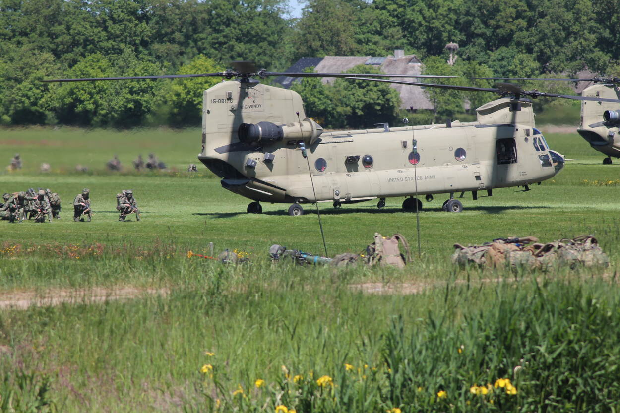 De tweede bijdrage aan deze rubriek van Assenaar Wim Veldman komt logischerwijs ook van die grote oefening van 13 Infanteriebataljon Luchtmobiel en het Defensie Helikopter Commando: Falcon Spring. Daaraan deden ook Amerikaanse helikopters, Chinooks en Black Hawks mee. Op de foto droppen een Nederlandse en een Amerikaanse CH-47 (bijnaam ‘Big Windy’) militairen en goederen bij de Ossensluis nabij De Wijk oftewel De Wiek zoals ze in Drenthe zeggen.