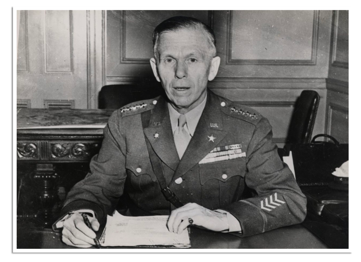 De Amerikaanse militair en staatsman George C. Marshall (1880-1959) was een Amerikaans militair en staatsman, die een cruciale rol speelde tijdens en na de Tweede Wereldoorlog. Hij dient van 1939 tot 1945 als chef-staf van het Amerikaanse leger. Na de oorlog wordt hij minister van Buitenlandse Zaken onder president Harry S. Truman en speelt een sleutelrol in de wederopbouw van Europa: het naar hem vernoemde Marshall Plan. Dat economisch herstelprogramma levert hem in 1953 de Nobelprijs voor de Vrede op.