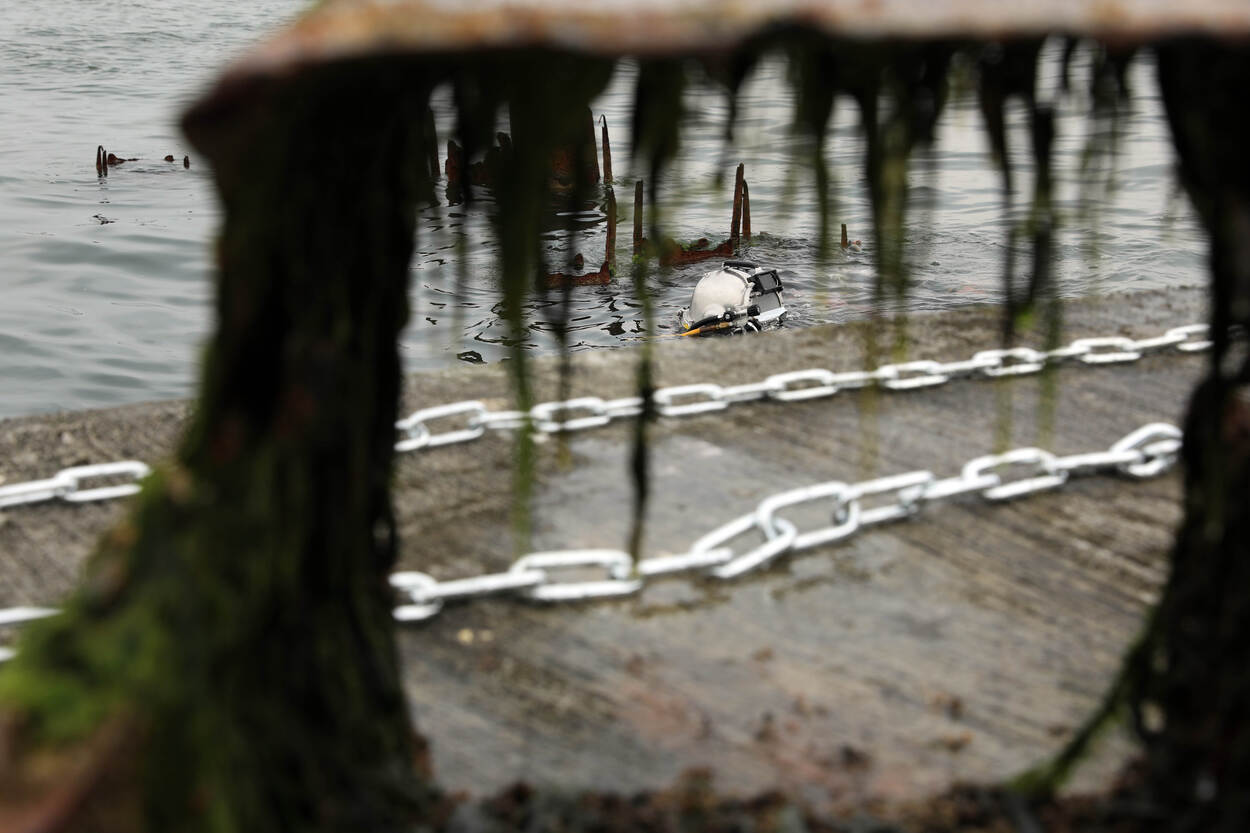 Een matroos van het Underwater Construction Team 1, Construction Dive Detachment Alpha, is net aan te zien door een stuk oude mast. Die wordt gebruikt bij een duiktraining, gericht op exotherm snijden onder water, tijdens de oefening Baltic Operations 2025 in Liepaja, Letland. BALTOPS 25, de belangrijkste maritieme oefening in de Baltische regio, is cruciaal voor de veiligheid in de Oostzee. (Foto US Navy/Melissa Russell)