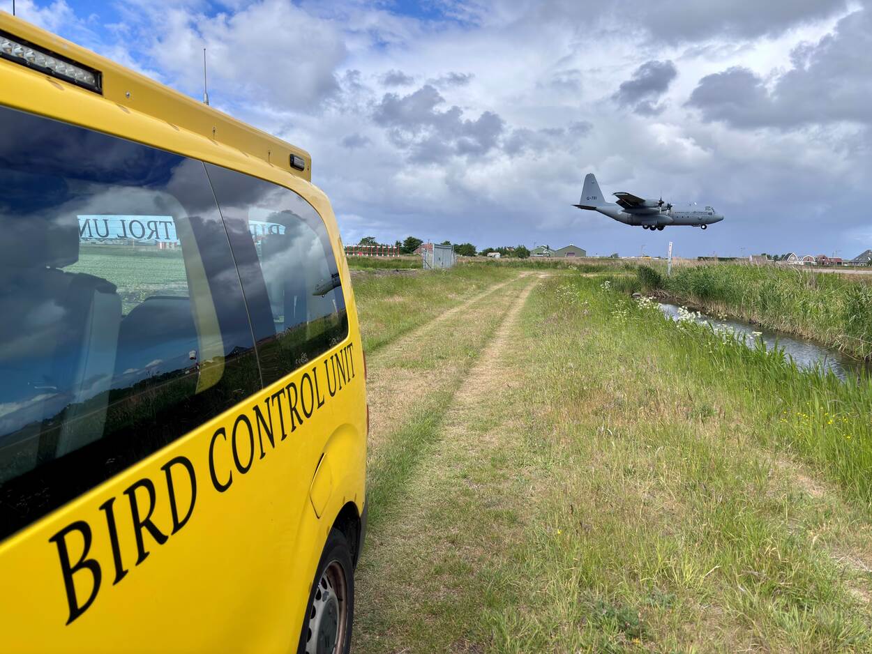 Waar we ook keken op de plaat: geen visarend, rode of zwarte wouw; nee, nog geen spreeuw, huismus, koolmees of appelvink te spotten. Hadden we even verder gelezen, dan was de bedoeling meteen duidelijk geweest. “Ik zag kans zowel mijn bird control-voertuig als de G-781 Hercules te fotograferen. Ik vind het persoonlijk mooi dat de tekst op mijn werkvoertuig duidelijk leesbaar is én dat de Hercules bezig is met zijn landing. De Hercules kwam hier voor een touch-and-go om daarna hier een landing te maken. Tijdens dit soort vliegactiviteiten zijn wij van de bird control unit altijd in de buurt om vogelaanvaringen te voorkomen.”