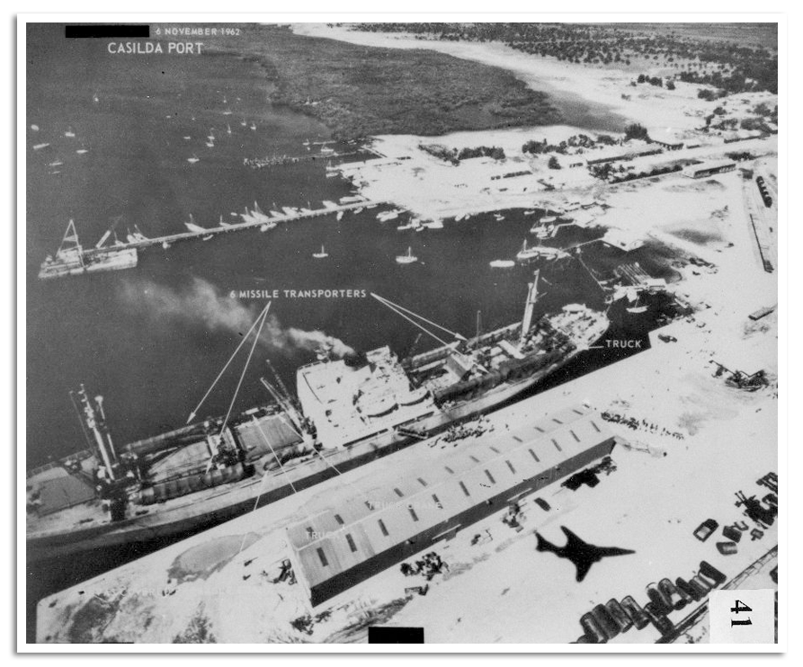Een spionagefoto van Port Casilda, Cuba. Een Russisch schip brengt raketten op het eiland: het begin van de Cuba Crisis en de aanleiding voor het aanleggen van een hotline. Op de foto is de schaduw van de McDonell RF-101 ‘Voodoo’ duidelijk te zien. (Archief US Central Command Air Forces Public Affairs)