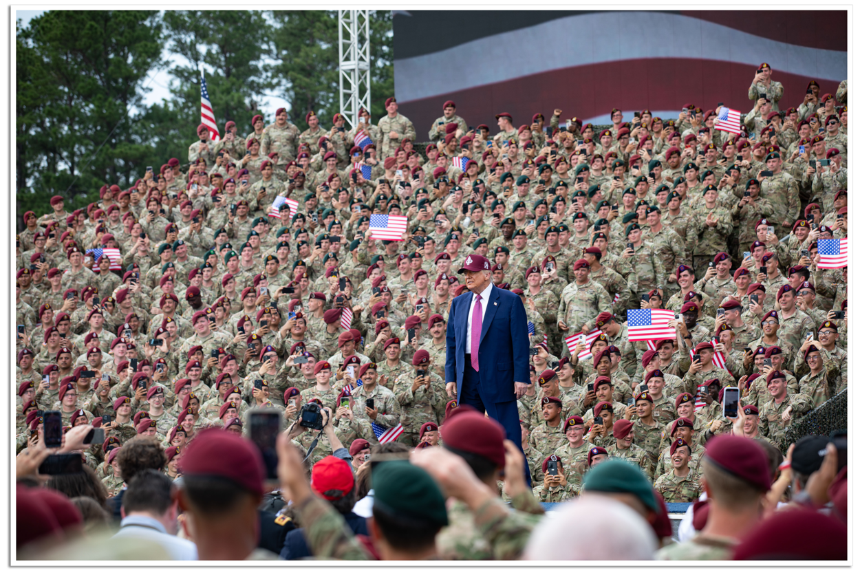 President Trump staat tussen militairen tijdens de viering van het 250-jarig bestaan van de US Army.