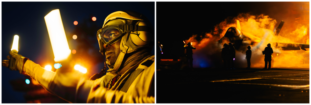 Adjudant van de marine Nicholas Ochieng helpt in het duister een vliegtuig op weg vanaf USS George Washington in de Filipijnenzee. De F-35C Lightning II van Strike Fighter Squadron (VFA) 147 staat op dat moment opgesteld bij de katapult. De USS George Washington Carrier Strike Group (GWA CSG) patrouilleert in het operationele gebied van de 7e Vloot van de VS. (Foto: US Navy, August Clawson)