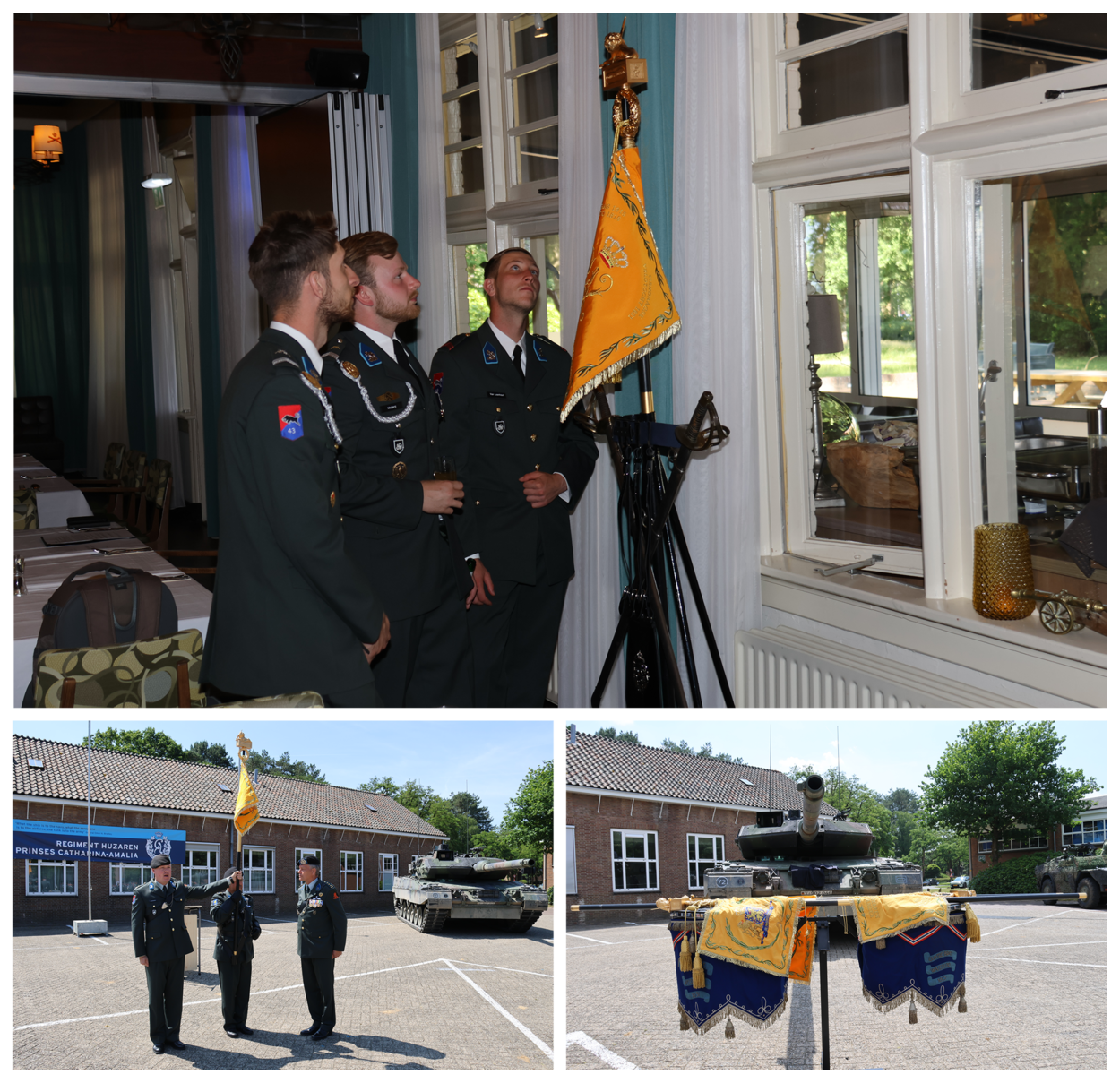 “We zijn de hele week bezig geweest met de uitreiking”, schrijft Dennis, “maar er zijn ook andere zaken gebeurd. Dinsdag vooroefening, woensdagochtend vooroefening, woensdagmiddag uitvoering uitreiking Standaard, inleveren Standaarden Regiment Huzaren Prins Alexander, Prins van Oranje en van Sytzama, woensdagavond Diner de Corps Onderofficieren waarbij de Standaard er voor het eerst bij was, donderdag vooroefening beëdiging, donderdagavond Diner der Korps Manschappen en Korporaals, vrijdag beëdiging op de nieuwe Standaard.”