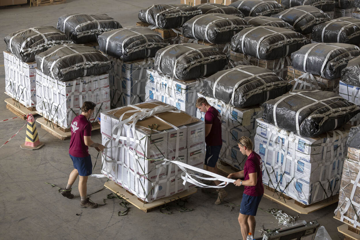 In een hal staan bundels noodgoederen opgesteld in rijen. Militairen zijn bezig met inpakken van een volgende pakket.