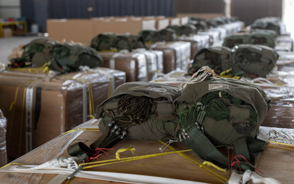 Speciaal opgeleide militairen van de luchtmobiele brigade besteden grote aandacht aan het veilig verpakken van de bundels noodgoederen.