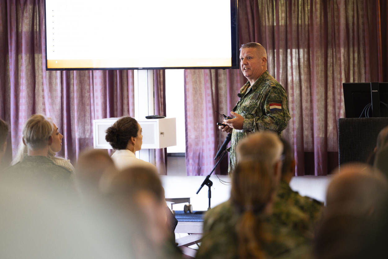 Majoor Danny Wolff spreekt op een podium voor een volle zaal.