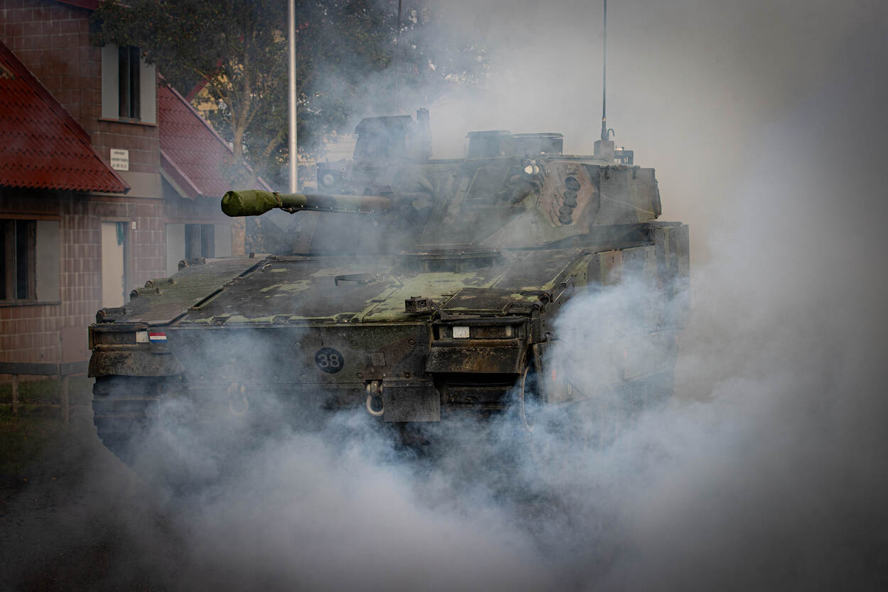 Een CV90 in een rookwolk.
