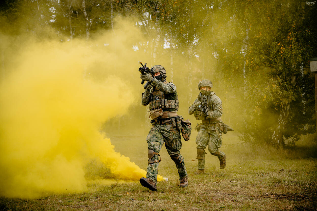 Pantserinfanteristen rennen door een gele rookwolk.
