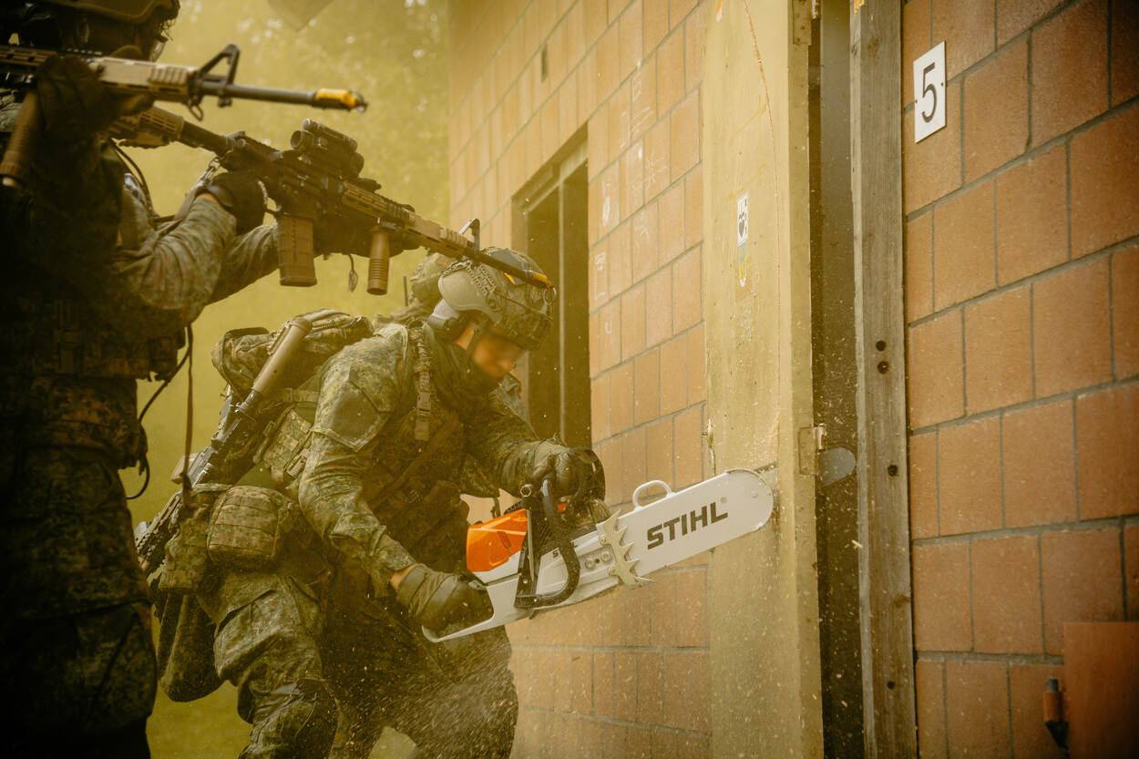 Een militair zaagt een deur van een oefenpand door midden.