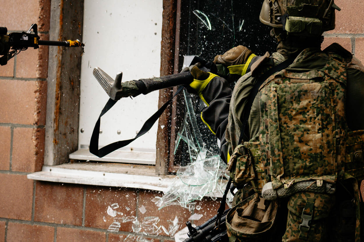 Een pantserinfanterist slaat een raam stuk.