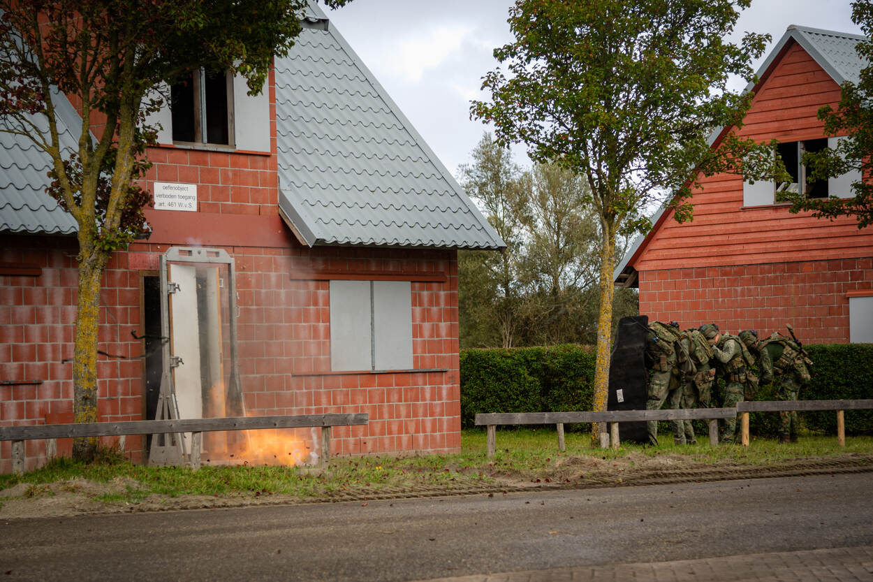 Militairen blazen een deur op in oefendorp Marnehuizen.
