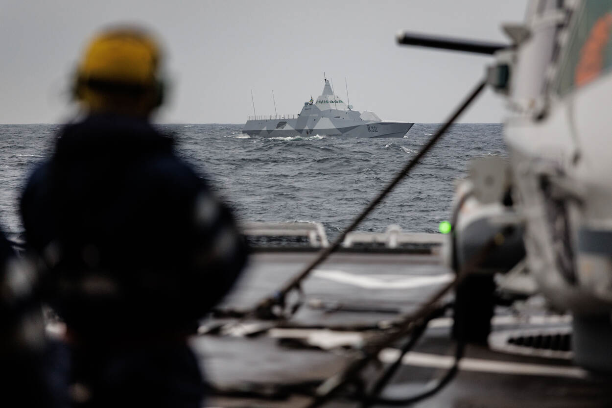 Bemanningsleden kijken naar een Zweeds oorlogsschip dat voorbij vaart.