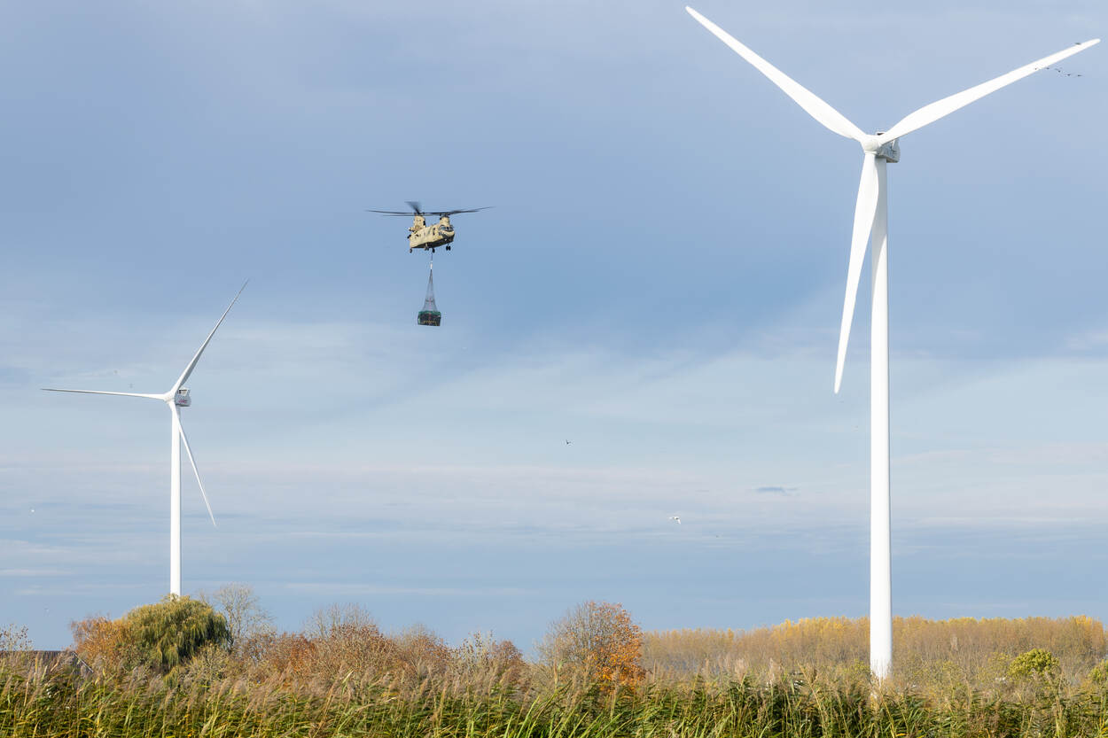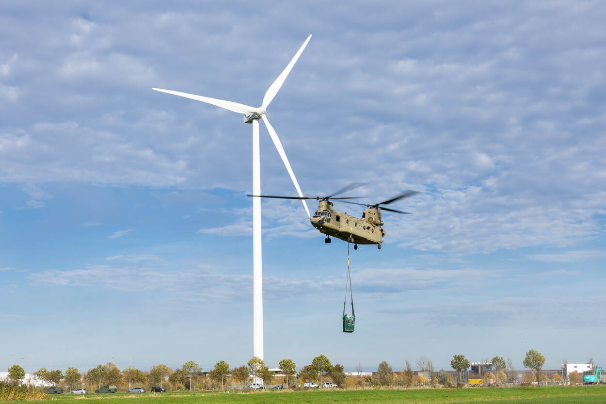 Een Chinook met lading vliegt tussen twee windmolens door.