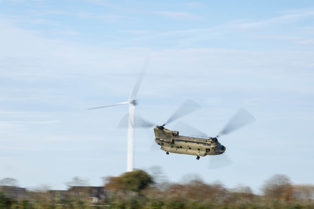 Een Chinook vliegt vlak boven bomen en langs een windmolen.