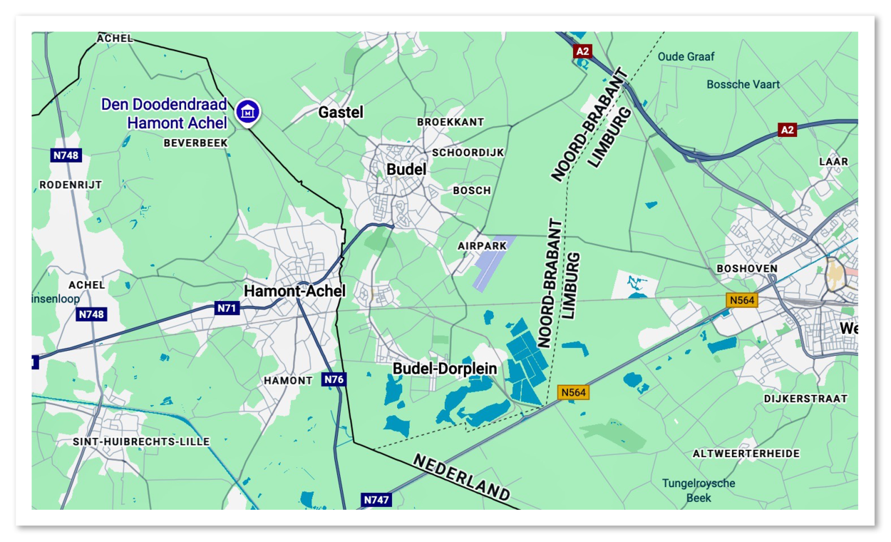 Kaart van de omgeving rondom Budel met wegen, dorpen zoals Hamont-Achel en Gastel, en een markering bij Den Doodendraad Hamont Achel.
