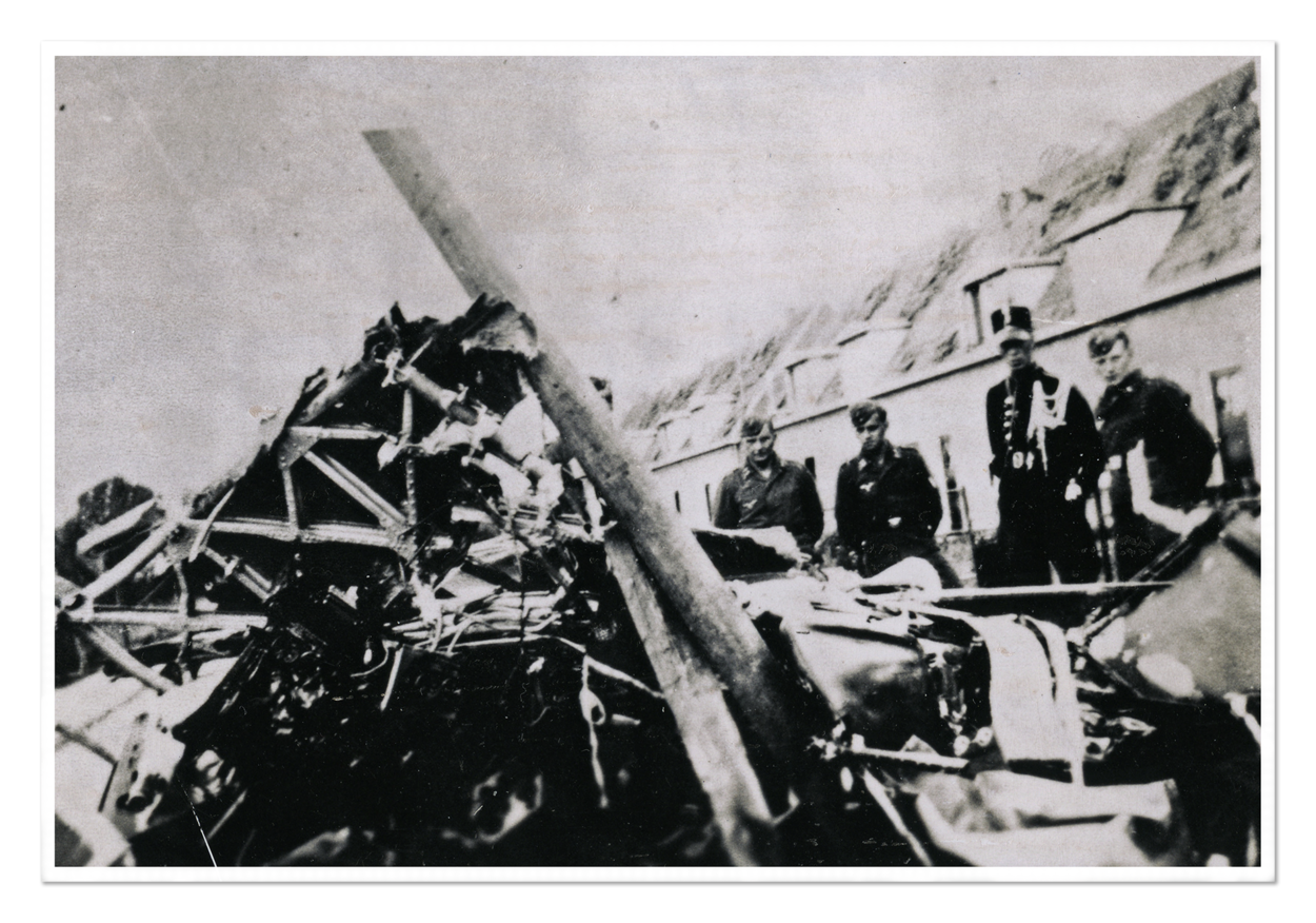 Een verwoest vliegtuig met vijf mannen eromheen, zwart-wit, genomen op 19 juni 1941, met puin en kapotte onderdelen.