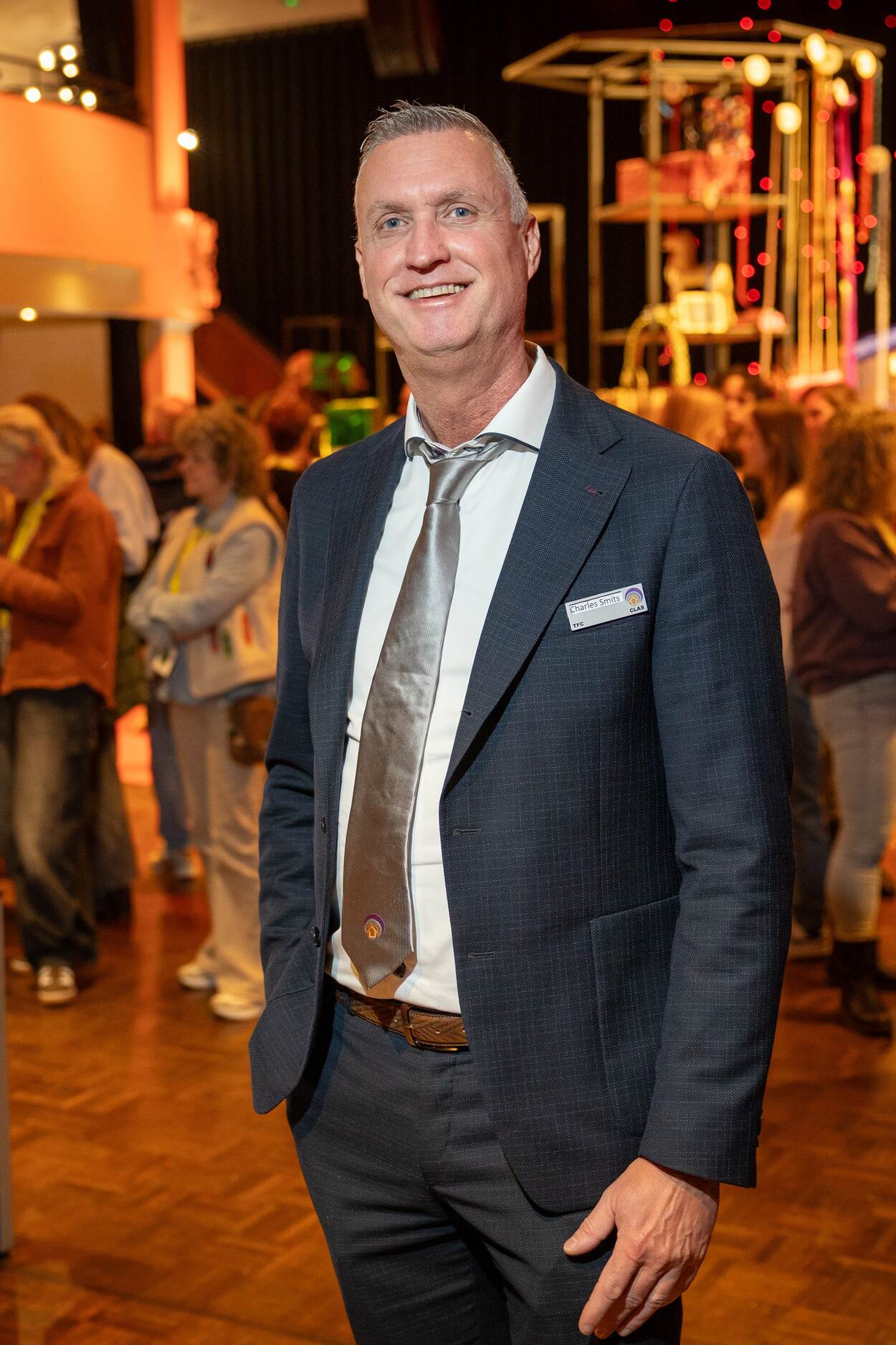Man in pak kijkt lachend in de camera en staat in zaal vol mensen.