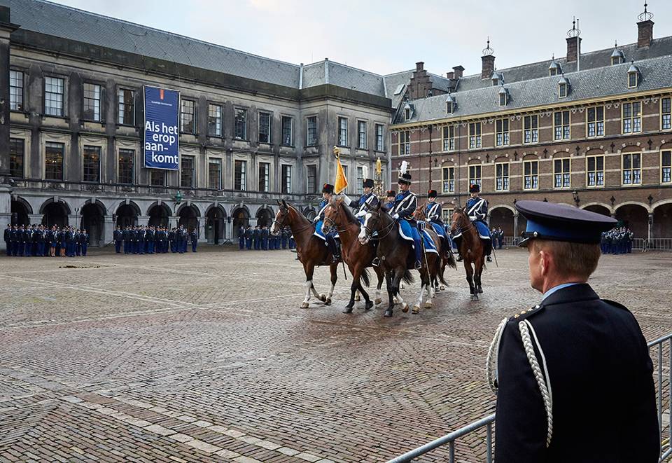 Het geluid van klikkende paardenhoeven galmt over het Binnenhof. De bereden standaardwacht van de Koninklijke Marechaussee komt in draf het plein op. Vol trots draagt de standaarddrager de standaard hoog in de lucht. Honderden jaren geleden deden zijn voorgangers dit te velde om strijdende troepen een richting te seinen. Nu is het puur ceremonieel en staan het afscheid van de oude standaard en de verwelkoming van het nieuwe ereteken centraal. Een bijzondere plechtigheid die de verbintenis met het koningshuis bevestigt.