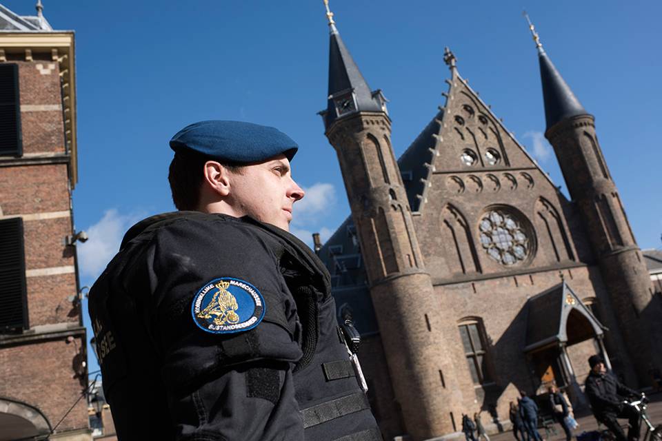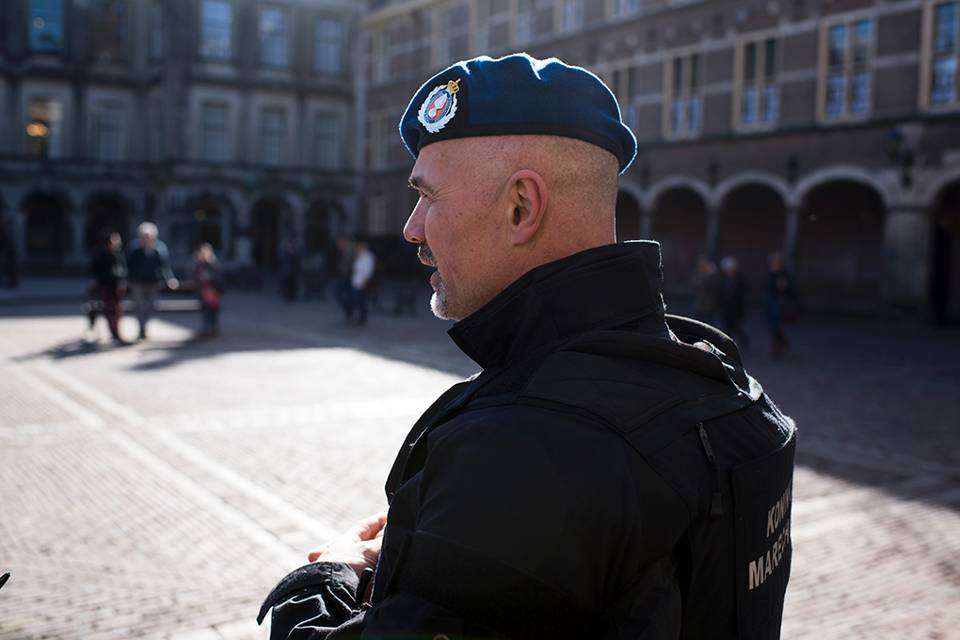 Ambtenaren die naar één van de ministeries fietsen, winkelend publiek en volle terrassen. De lente hangt in de lucht en in de hofstad is het business as usual. Of toch niet helemaal? Met de inzet van de Bijstandseenheid (BE) van de Koninklijke Marechaussee voor de bewaking en beveiliging van bepaalde gebouwen en instellingen is er wel degelijk wat veranderd: de Marechaussee is prominenter aanwezig in het straatbeeld.