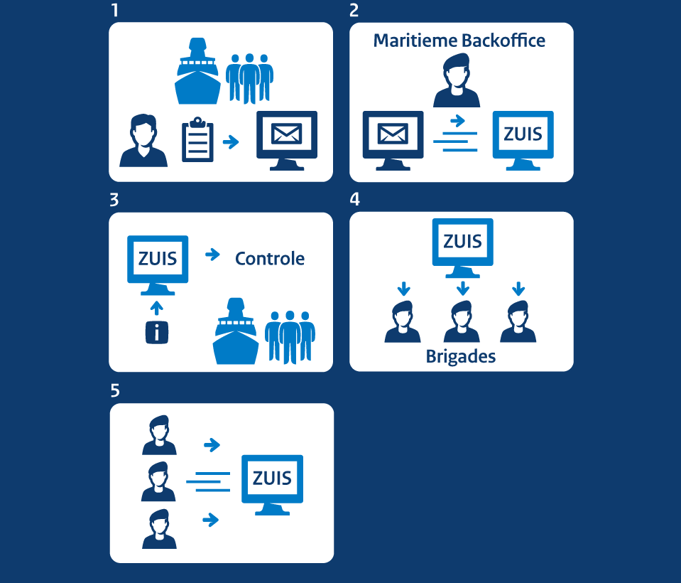 Het ZUIS maakt een risicoanalyse van een schip. Welk schip komt op een bepaalde tijd aan in een Nederlandse haven en wat is de herkomst? Deze gegevens worden in het ZUIS gecombineerd met de passagiers- en bemanningslijsten. Ook personen die eventueel aan- en afmonsteren staan op die lijsten. Door deze informatie te koppelen aan opsporingssystemen beschikken de collega's over de gewenste voorkennis en kunnen ze risico's al vooraf onderkennen en maatregelen nemen voordat een schip aanlegt in een haven.