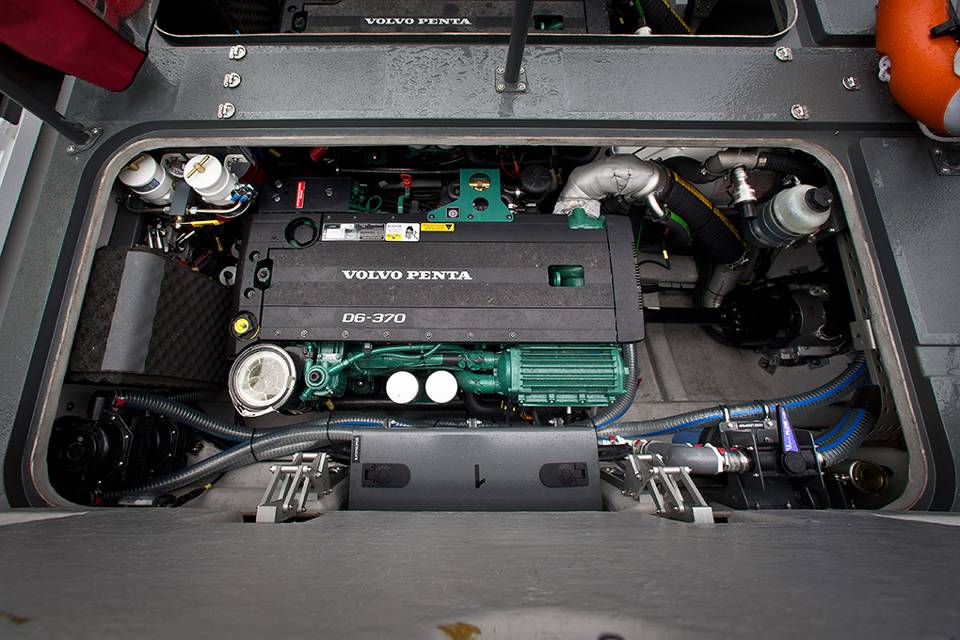 Een van de 2 'monsters' aan boord. Een Volvo Penta-motor van 370 pk. Maal 2 levert dat een vermogen van 740 pk, goed voor een topsnelheid van bijna 80 kilometer per uur.