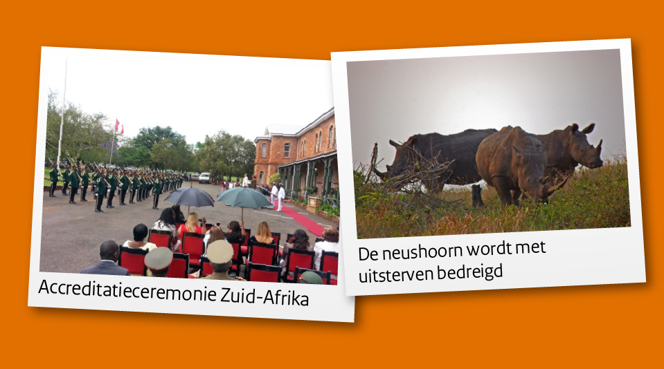 Zuid-Afrika is bekend vanwege de verscheidenheid aan natuurparken die het land rijk is. Voor de vele (Nederlandse) toeristen die het land bezoeken vormt het Kruger Nationaal Park een highlight. Daar is een desastreuze toename van stroperij. Met name de neushoorn moet het ontgelden. Zelfs inzet van de Zuid-Afrikaanse strijdkrachten lijkt dit tij niet te kunnen keren. Samen met de landbouwattaché zoeken we naar mogelijkheden om anti-stroperij te ondersteunen."