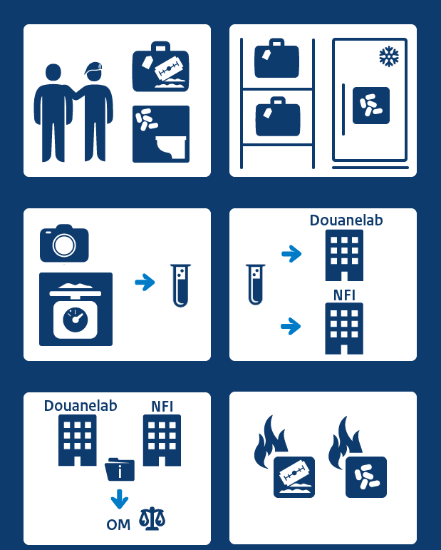 De KMar stuurt de monsters van de drugs naar het Douanelab. Daar wordt de drugssoort vastgesteld. De Marechaussee schakelt het Nederlands Forensisch Instituut in voor complexe zaken, bijvoorbeeld als de drugs zijn geïmpregneerd in materialen.