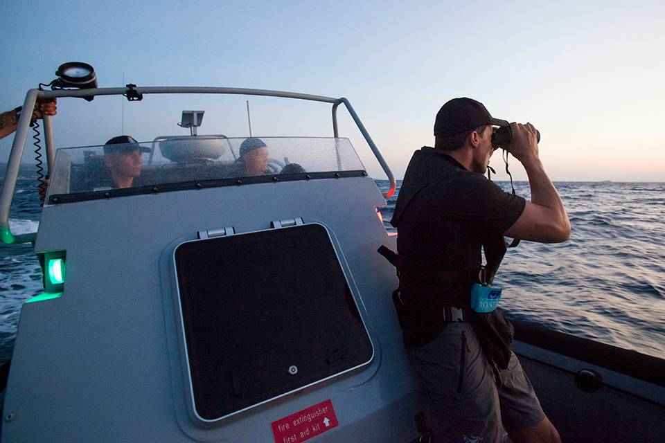 De bemanningsleden speuren de zee af naar opvallende bewegingen.