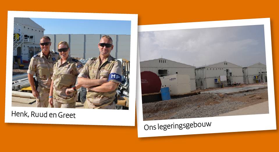 We verblijven op het Multinational Camp dat nog niet af is, maar waar iedere dag hard wordt gewerkt. Omdat onze kantoorruimtes nog niet klaar zijn, werken we op dit moment vanuit een alternatieve locatie. Dit begon primitief maar heeft zich inmiddels tot een prima werkbare locatie ontwikkeld.