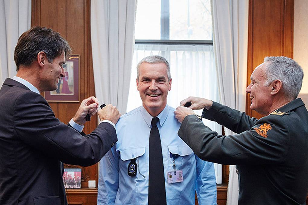 "Natuurlijk voelde ik het de laatste tijd wel aankomen", vervolgt Van den Brink over zijn voordracht tot Commandant KMar. De weg ernaar toe omschrijft hij zelf als een groeiproces. "Ik heb veel verschillende functies vervuld. Buiten werktijd volgde ik diverse opleidingen. Overal heb ik ervaring opgedaan en geleerd. Ik heb me altijd verantwoordelijk gevoeld voor mijn werk, maar ook voor het grotere geheel, de organisatie. Ik vind mijn benoeming een hele verantwoordelijkheid en een hele eer. Ik was erg blij toen ik hoorde dat alles rond was."