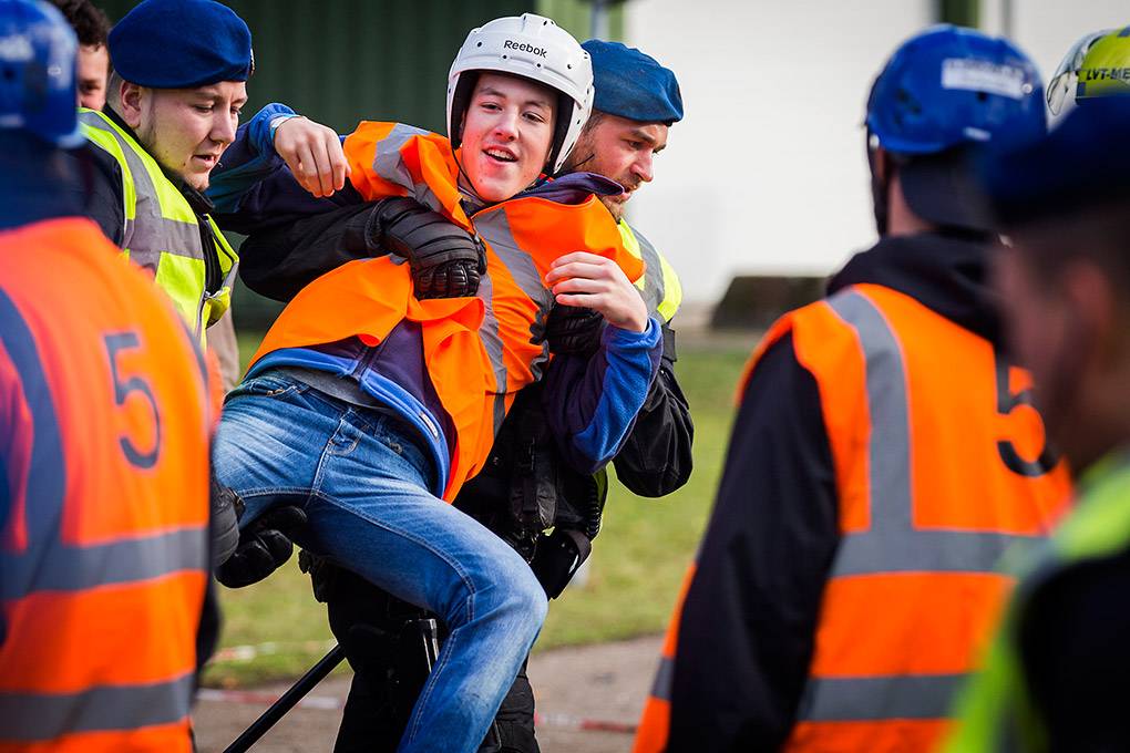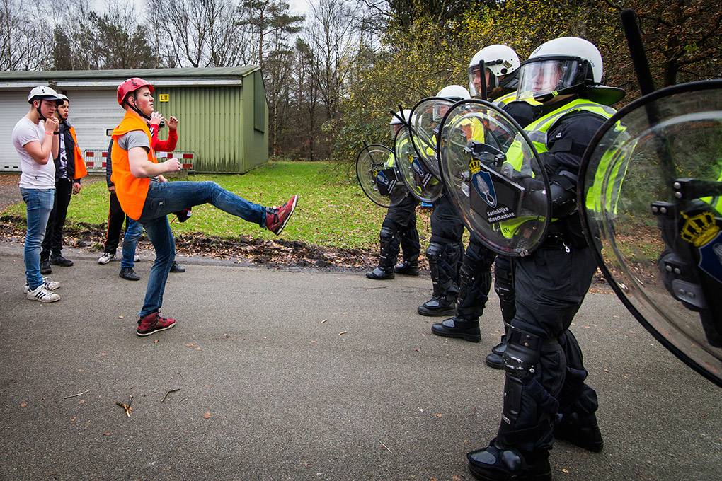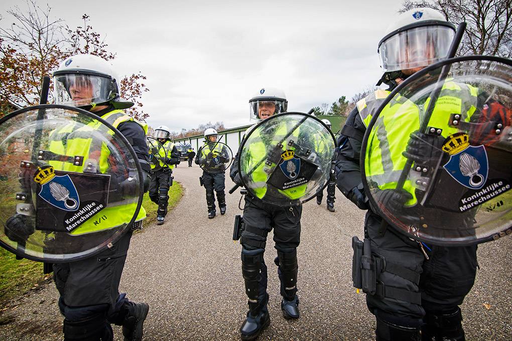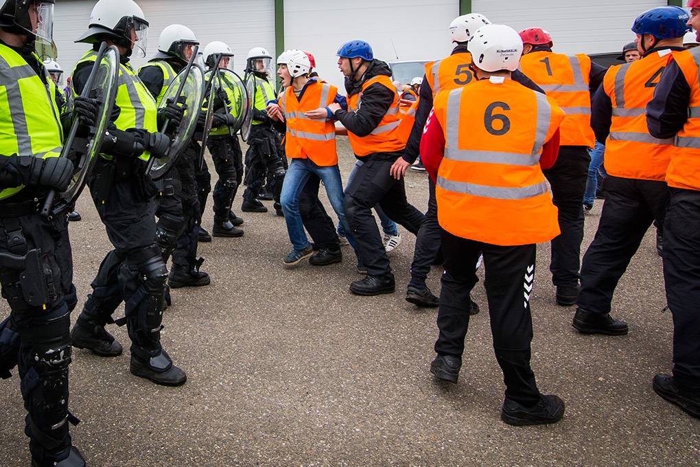 De collega's van de Bijstandseenheid (BE) van de Koninklijke Marechaussee zijn gespecialiseerd in het optreden in het hoge geweldsspectrum. Maar de BE kan de Mobiele Eenheid van de Nationale Politie ook ondersteunen als er moet worden opgetreden in het lage geweldsspectrum, zoals bij het aanspreken van personen waarbij niet vanaf het eerste moment een helm en schild nodig zijn. Door samen te trainen kunnen de KMar en de Nationale Politie procedures op elkaar afstemmen en in de praktijk toepassen. De afgelopen periode gebeurde dat op het mobilisatiecomplex Ede-Driesprong. Tijdens het bezoek van fotograaf Valerie Kuypers liep een fictieve huldiging van het voetbalelftal van Oranje-Zwart compleet uit de hand.