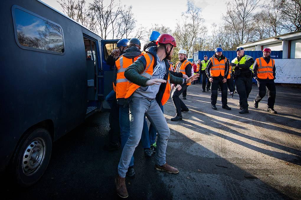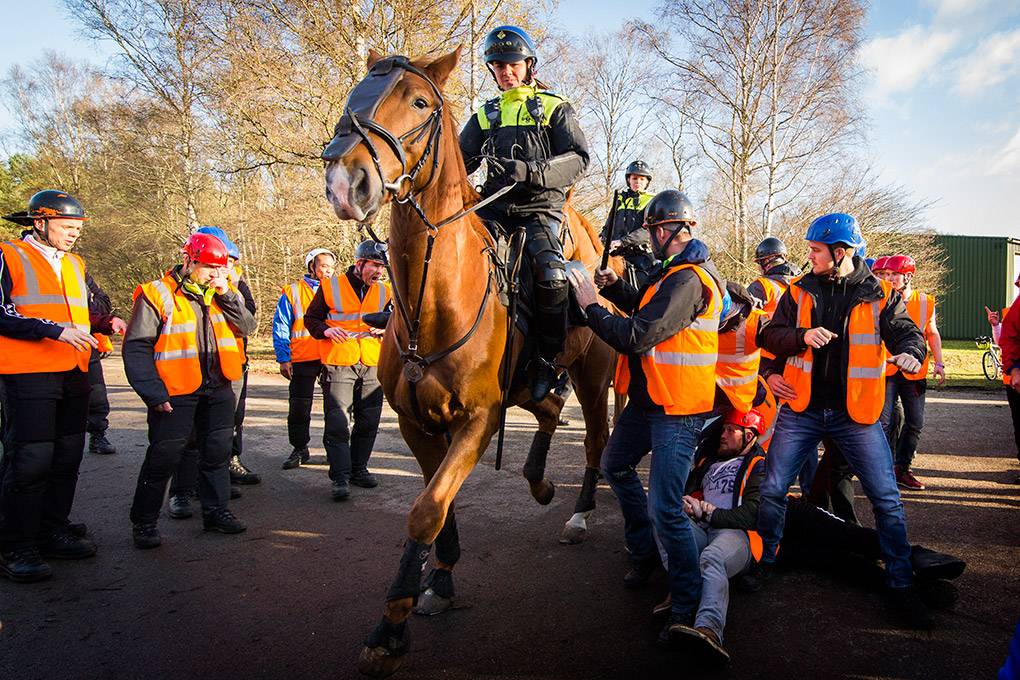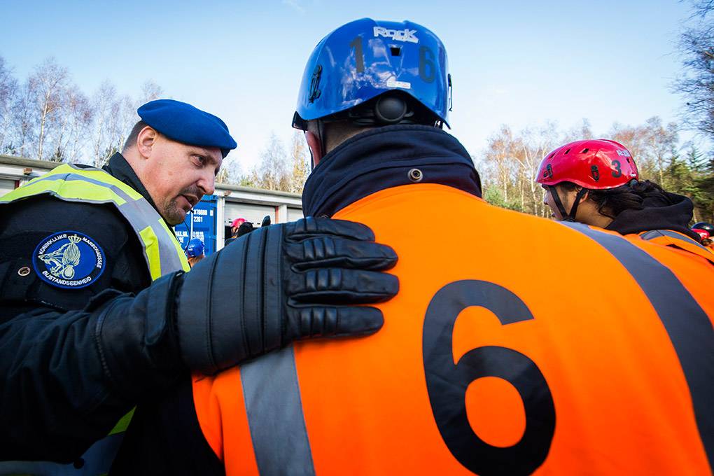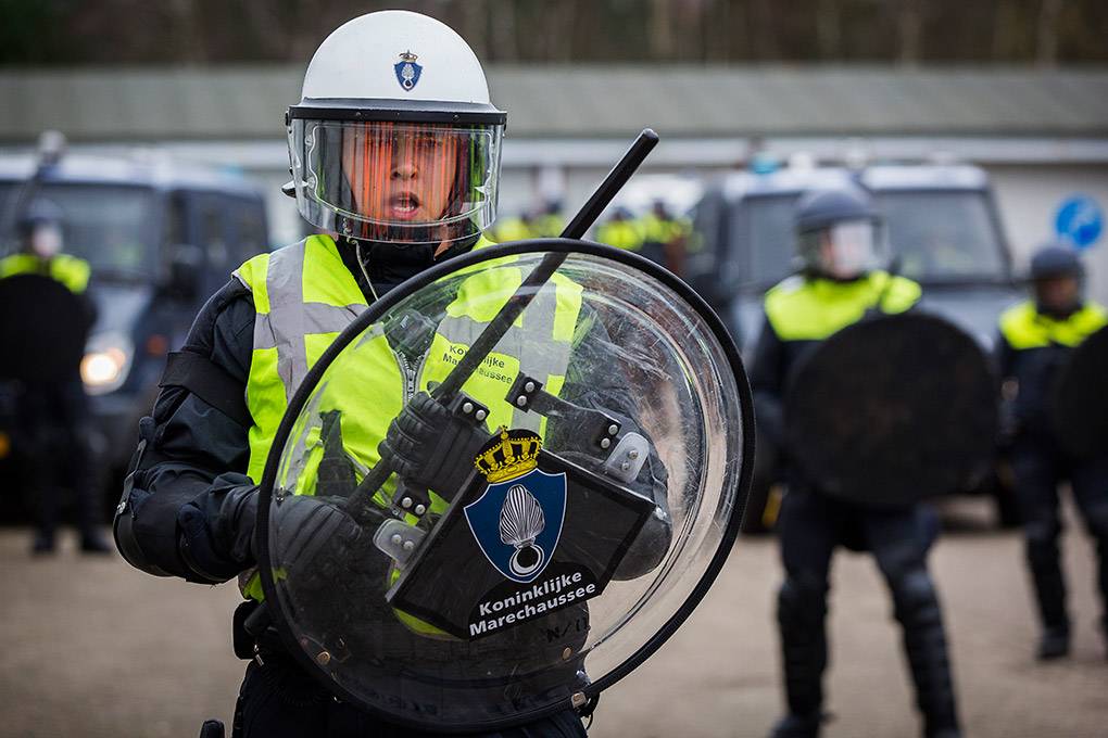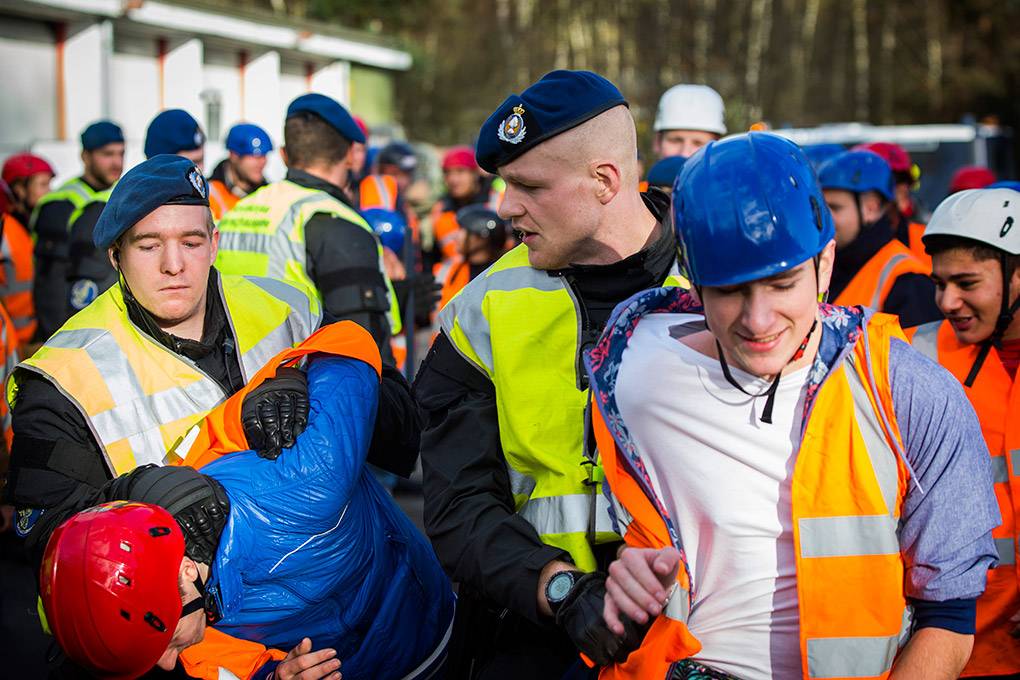 De collega's van de Bijstandseenheid (BE) van de Koninklijke Marechaussee zijn gespecialiseerd in het optreden in het hoge geweldsspectrum. Maar de BE kan de Mobiele Eenheid van de Nationale Politie ook ondersteunen als er moet worden opgetreden in het lage geweldsspectrum, zoals bij het aanspreken van personen waarbij niet vanaf het eerste moment een helm en schild nodig zijn. Door samen te trainen kunnen de KMar en de Nationale Politie procedures op elkaar afstemmen en in de praktijk toepassen. De afgelopen periode gebeurde dat op het mobilisatiecomplex Ede-Driesprong. Tijdens het bezoek van fotograaf Valerie Kuypers liep een fictieve huldiging van het voetbalelftal van Oranje-Zwart compleet uit de hand.