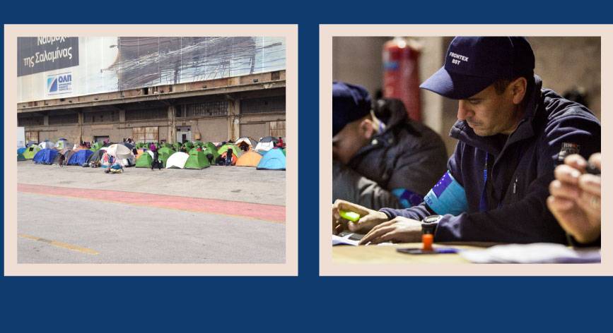 Links: Migranten in de haven van Piraeus, Athene. || Rechts: Het Border Security Team aan het werk op Chios.